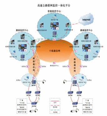 該系統(tǒng)集數(shù)字視頻傳輸、視頻管理、視頻存儲(chǔ)以及外網(wǎng)發(fā)布等功能為一體。 EV701中心設(shè)備有4個(gè)業(yè)務(wù)槽,可任意插拔編解碼卡,最多支持8路視音頻數(shù)據(jù)。采用H.264編碼標(biāo)準(zhǔn)的EV702外場(chǎng)綜合接入設(shè)備,將原來(lái)外場(chǎng)分散的攝像頭、快球、云臺(tái)、可變情報(bào)板、報(bào)警感應(yīng)器等設(shè)備融為一體,同時(shí)也支持MPEG編碼標(biāo)準(zhǔn)的視音頻接入。可以同時(shí)編碼2路以上的視音頻信號(hào),支持雙流傳輸,D1數(shù)據(jù)用于實(shí)時(shí)觀看,CIF數(shù)據(jù)用于存儲(chǔ)和Web網(wǎng)業(yè)務(wù)(包括對(duì)外發(fā)布實(shí)時(shí)圖像和管理人員異地監(jiān)控)。具備IP開(kāi)關(guān)斷功能,減輕了通信網(wǎng)絡(luò)的壓力。 路級(jí)中心、區(qū)域中心、省級(jí)中心分布式多級(jí)監(jiān)控,由省中心統(tǒng)一設(shè)定權(quán)限,進(jìn)行集中管理。