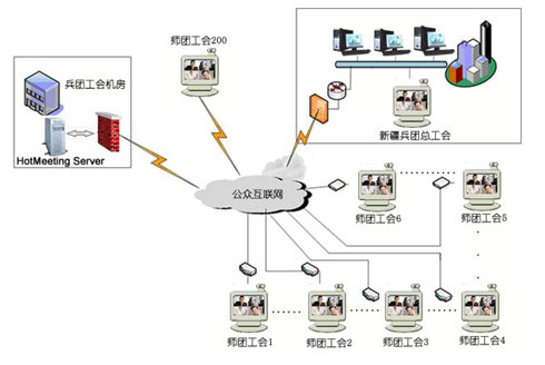 新疆建設(shè)兵團(tuán)工會下設(shè)有14個(gè)師工會,111個(gè)團(tuán)場工會.共有200個(gè)用戶同時(shí)參加視頻會議。中心服務(wù)器帶寬為100M光纖,各地終端通過網(wǎng)通2M寬帶接入,每個(gè)師、團(tuán)級會場都有自己獨(dú)立的機(jī)房和會議室,適合進(jìn)行基于IP網(wǎng)絡(luò)視訊會議的應(yīng)用,在這個(gè)網(wǎng)絡(luò)平臺上,優(yōu)視(URSACOM)HotMeeting富媒體視頻會議系統(tǒng)所提供的高質(zhì)量的視頻圖像和方便易用的文檔、文件共享功能,使得兵團(tuán)工會領(lǐng)導(dǎo)能夠在這個(gè)平臺上進(jìn)行從桌面討論到會議室正式會議等各種規(guī)模應(yīng)用。通過HotMeeting富媒體視頻會議系統(tǒng),除了進(jìn)行全團(tuán)工會系統(tǒng)例會,工作交流等常見的應(yīng)用之外,遠(yuǎn)程培訓(xùn)等也是經(jīng)常進(jìn)行的內(nèi)容。各個(gè)師、團(tuán)工會系統(tǒng)能利用數(shù)據(jù)功能和兵團(tuán)總工會協(xié)調(diào)業(yè)務(wù),也能把平常培訓(xùn)的會議材料進(jìn)行詳細(xì)介紹,節(jié)約了以前培訓(xùn)所花費(fèi)的大量精力和時(shí)間。具體網(wǎng)絡(luò)拓?fù)湟娤聢D:
