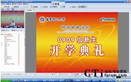 CTI論壇(ctiforum)9月30日消息:9月26日,華東理工大學(xué)網(wǎng)絡(luò)教育學(xué)院09級新生開學(xué)典禮上午9:00隆重舉行,主會(huì)場設(shè)在華東理工大學(xué)校本部(梅隴路130號)八教201室,并通過紅杉樹網(wǎng)絡(luò)視頻會(huì)議系統(tǒng)與校外各教育中心一起召開。