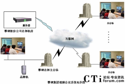 攀鋼股份公司目前工作現(xiàn)況,平時工作上的交流主要依靠電話、電子郵件,這種傳統(tǒng)的方式常常耽誤時間、浪費資源,同時也使人容易疲勞。而對于一些突發(fā)事件,傳統(tǒng)的溝通方式不能及時開展有效的組織討論。對此情況,攀鋼集團準(zhǔn)備把紅杉樹網(wǎng)絡(luò)視頻會議系統(tǒng)擴展到每個人自己桌面上來召開討論會議,以達成節(jié)約時間,減少費用,縮短決策的時間與周期,提高了各個部門在運作上的效率等方面的目標(biāo)。根據(jù)本項目的具體規(guī)模及應(yīng)用需求,系統(tǒng)部署如下圖所示: