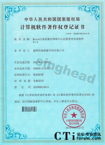 CTI論壇(ctiforum)5月19日消息(記者 楊佳林):2010年4月27日,深圳市深海捷科技有限公司申請的《Mixcall家政服務網(wǎng)絡中心運營管理系統(tǒng)軟件V1.0》著作登記獲得國家版權局審核并通過。