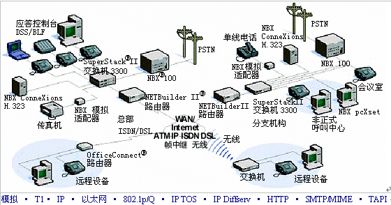 使用標準多協(xié)議路由器,諸如3Com PathBuilder或NET Builder II路由器,您能夠通過廣域網(wǎng)或Internet將多個分支機構(gòu)與您的總部系統(tǒng)相連接。您可以隨意選擇網(wǎng)絡(luò): 支持工業(yè)標準Internet協(xié)議(IP)聯(lián)網(wǎng)的DSL、電纜、幀中繼或ISDN。您甚至能夠通過使用3Com NBX ConneXtions H.323網(wǎng)關(guān)應(yīng)用,來充分利用低成本、高質(zhì)量的IP語音 (VoIP) H.323服務(wù)。因為NBX ConneXtion使用Internet作為長途線路上本地到本地的撥號路徑,因此它能夠以極低的成本提供傳統(tǒng)電話專用線路和后端分機(OPX)線路的優(yōu)勢。