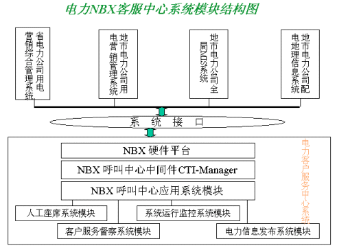 該方案以美國3COM公司的NBX產(chǎn)品為系統(tǒng)平臺,結(jié)合其配套的中間件產(chǎn)品CTI-Manager和上層第三方專業(yè)的電力行業(yè)應(yīng)用系統(tǒng),為各省、市電業(yè)公司建立起新型的電力呼叫中心(Call Center)。使電力客服中心系統(tǒng)以呼叫中心為基礎(chǔ),以電力系統(tǒng)其他后方資源信息(CIS,DMS,負控等系統(tǒng))為依托,為客戶提供電話、傳真、郵件、Internet等多種接入方式,通過和電力其他業(yè)務(wù)系統(tǒng)有機的結(jié)合,滿足客戶不同層次、個性化與多樣化的業(yè)務(wù)需求,提供了包括錄音、會議電話、統(tǒng)一消息和智能路由在內(nèi)的多種功能。