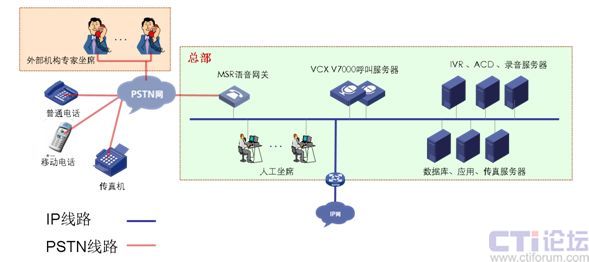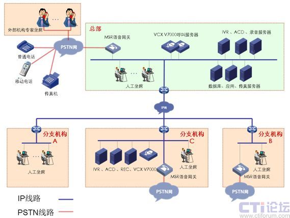 分支機構B:網絡通過VPN技術與總部實現數據語音傳輸,部署MSR語音網關與當地PSTN網連接,IP坐席。兩地申請相同的客服號碼,兩地內撥打客服號碼,客戶無長途話費產生。適用與總部與分支處在不同省市。