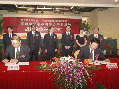 簽約儀式在密云瑞海姆田園度假村舉行,雙方就共建北京呼叫中心產業(yè)基地項目簽訂了《共同建設北京呼叫中心產業(yè)基地戰(zhàn)略合作協(xié)議》,北京市副市長茍仲文同志、中國網通(集團)有限公司董事長兼總裁左迅生、副總裁姜正新,北京市發(fā)展改革委、規(guī)劃委等市政府相關部門、密云縣人民政府、中國網通(集團)有限公司以及多家新聞媒體共計100余人參加了儀式。