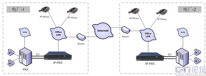 對于傳統(tǒng)的PBX改造,可以通過IP PBX的E1端口進行連接,通過PRI或R2信令進行通信,這樣傳統(tǒng)PBX下的分機就可以通過撥打連接IP PBX的中繼出局號來撥入VOIP系統(tǒng),例如撥“0”到PSTN,撥“9”到IP PBX。兩個電廠的傳統(tǒng)分機,可以撥“9”后直接撥打對方分機,而IP話機都可以通過直撥的方式互通。