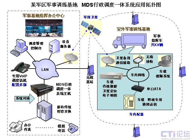 為了加強(qiáng)現(xiàn)代化軍隊(duì)的建設(shè),某軍區(qū)在其軍分區(qū)的指揮訓(xùn)練基地,使用先進(jìn)的技術(shù),搭建了一套由幾十輛軍事指揮車組成的作戰(zhàn)指揮訓(xùn)練系統(tǒng),其中的語(yǔ)音通信指揮系統(tǒng)部分,采用了美國(guó)Zed-3公司最先進(jìn)的基于IP技術(shù)的MDS80行政調(diào)度一體化通信系統(tǒng),解決了訓(xùn)練基地的指揮中心大樓的原有通信系統(tǒng),與室外的訓(xùn)練基地各輛指揮車之間,通過(guò)基地?zé)o線網(wǎng)絡(luò)及衛(wèi)星備份鏈路提供的IP通道,實(shí)現(xiàn)語(yǔ)音的指揮調(diào)度通信,達(dá)到訓(xùn)練基地要求的最佳的語(yǔ)音指揮調(diào)度通信效果。