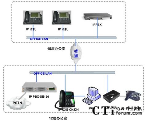 隨著企業(yè)規(guī)模的不斷擴展,公司在15層新增約50人的辦公區(qū),需要和12層實現(xiàn)內(nèi)部通訊免費(直撥分機號碼),出局路由沿用現(xiàn)有ISDN線路。現(xiàn)有的傳統(tǒng)的集團電話設(shè)備已經(jīng)滿配,無法適應(yīng)企業(yè)規(guī)模的擴張,無法跨地域組網(wǎng),不能建立多點分布式的內(nèi)部電話系統(tǒng),不能充分利用現(xiàn)有的IP網(wǎng)絡(luò)資源發(fā)展有助于提高企業(yè)競爭力的網(wǎng)絡(luò)增值業(yè)務(wù)。