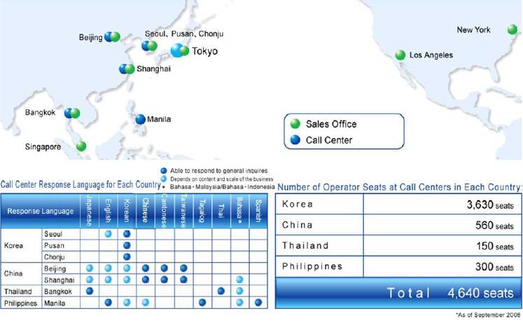 transcosmos運(yùn)用亞洲各呼叫中心營運(yùn)點(diǎn)提供客戶所需的業(yè)務(wù)種類和語言服務(wù)。每個(gè)運(yùn)營分部支持包括本地語言的多語種, 較少的運(yùn)營點(diǎn)覆蓋低業(yè)務(wù)量地區(qū)從而實(shí)現(xiàn)客戶要求的較低的運(yùn)營成本。這對滿足那些多語種要求的客戶來說尤其重要。