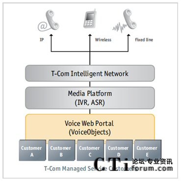 媒體平臺(tái)驅(qū)動(dòng)器提交了高功能性和投資保護(hù)。T-Com選擇VoiceObjects的一個(gè)主要考慮是一組媒體平臺(tái)驅(qū)動(dòng)器,它們作為VoiceObjects服務(wù)器和一百多個(gè)經(jīng)過(guò)VoiceObjects實(shí)驗(yàn)室認(rèn)證的媒體平臺(tái)之間的接口。通過(guò)VoiceObjects服務(wù)器,T-Com享受到了平臺(tái)廠商的無(wú)關(guān)性和應(yīng)用開發(fā)工作的投資保護(hù),以及媒體平臺(tái)版本之間、媒體平臺(tái)廠商之間和標(biāo)志語(yǔ)言標(biāo)準(zhǔn)的版本之間(比如從VoiceXML