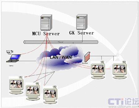 當(dāng)召開多點的交互式會議時則需要MCU(多點控制器)的參與。MCU的作用類似于交換機,主要完成各會場圖像的切換和語音的混音功能,一般放置在主會場。在MCU的控制下可以實現(xiàn)語音激勵、導(dǎo)演控制等多種會議控制方式。