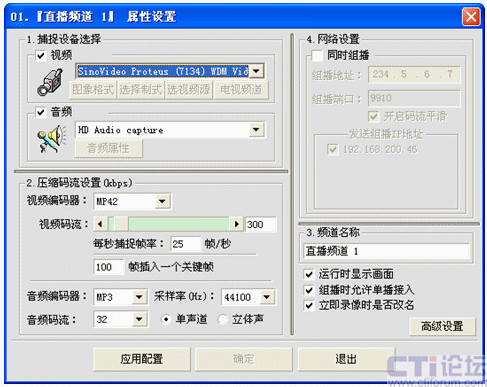 用鼠標(biāo)右鍵點(diǎn)擊直播頻道管理下的某個(gè)頻道號,我這里選擇01:在彈出的右鍵菜單中選擇“直播頻道設(shè)置”或者點(diǎn)擊工具欄里的“頻道設(shè)置”圖標(biāo),出現(xiàn)下面的設(shè)置圖: