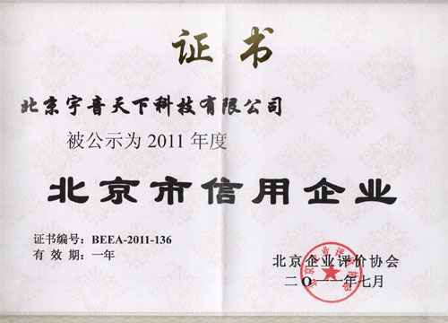 宇音天下獲評(píng)2011年度“北京市信用企業(yè)”