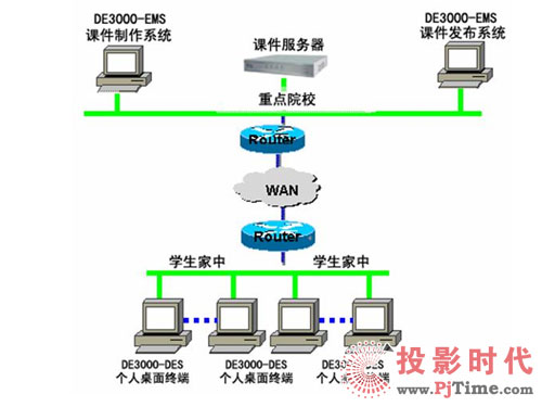 如上圖所示: DE3000系列中的DE3000-DES(個人桌面軟件終端)與DE3000-EMS(課件制作發(fā)布系統(tǒng)),主要用于學(xué)校與學(xué)生間通過觀看電子課件的形式進(jìn)行的多媒體遠(yuǎn)程教育。在學(xué)校的多媒體制作中心配備DE3000-EMS(課件制作發(fā)布系統(tǒng)),在學(xué)生家中的電腦上安裝DE3000-DES(個人桌面軟件終端),即可實(shí)現(xiàn)學(xué)校對多媒體電子課件的制作與發(fā)布,以及學(xué)生可以在家觀看電子課件的內(nèi)容。當(dāng)然,還可以在醫(yī)院的會議室或?qū)W校的多媒體教室配備DE3000視頻點(diǎn)播系統(tǒng),使分布在各地的醫(yī)生、學(xué)生能夠收看實(shí)時的廣播或在點(diǎn)播培訓(xùn)內(nèi)容,并通過網(wǎng)上課件復(fù)習(xí),通過電子郵件提問和提交作業(yè)。