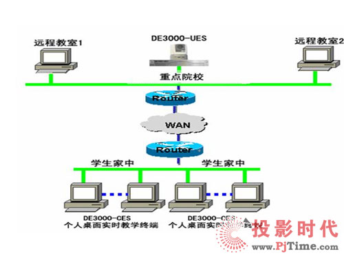 如上圖所示:DE3000系列中的DE3000-CES(個人桌面實(shí)時教學(xué)終端)主要用于學(xué)生在家里的PC上與學(xué)校的老師進(jìn)行實(shí)時的面對面授課。在學(xué)校的多媒體教室配備DE3000-UES(遠(yuǎn)程教育終端設(shè)備),在學(xué)生家中的電腦上安裝DE3000-CES(個人桌面實(shí)時教學(xué)終端),即可實(shí)現(xiàn)遠(yuǎn)程實(shí)時授課,其高質(zhì)量的音視頻效果與強(qiáng)大的數(shù)據(jù)功能,使學(xué)生猶如坐在教室里上課一樣,可體現(xiàn)出強(qiáng)烈現(xiàn)場感。