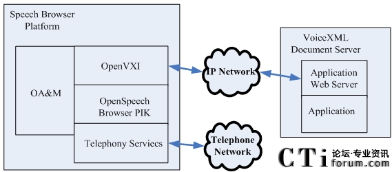 OpenVXI本身只是VoiceXML平臺(tái)的一個(gè)組件[32],它只是提供了簡(jiǎn)單的語(yǔ)音識(shí)別、語(yǔ)音提示和TTS(text-to-speech)功能。而對(duì)于電話功能,由于語(yǔ)音卡的種類(lèi)繁多,同時(shí)VoIP(Voice