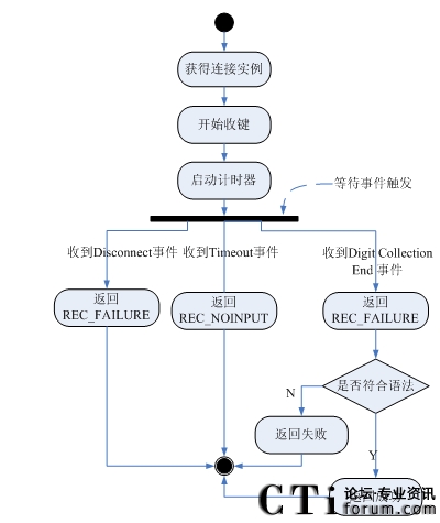 4)如果接收到SC_EVENT_DISCCONET事件,表示用戶(hù)主動(dòng)放棄,返回REC_FAILURE,調(diào)用EndSession,流程結(jié)束;如果接收到SC_EVENT_TIMEOUT事件,表示用戶(hù)在計(jì)時(shí)器的時(shí)間內(nèi)沒(méi)有輸入,返回REC_NOINPUT,調(diào)用EndSession,流程結(jié)束;如果接收到SC_EVENT_DTMF_RECEIVED事件,表示用戶(hù)輸入完畢,進(jìn)入下一步;