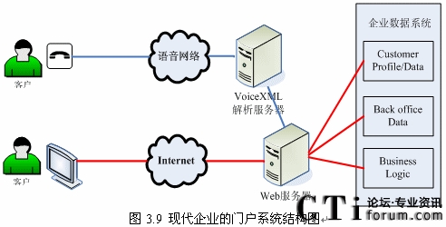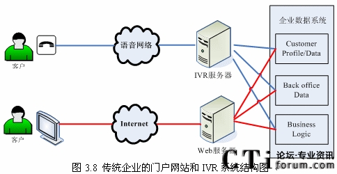 隨著Internet和Web技術的迅速發(fā)展,越來的企業(yè)開始建立自己的門戶網站,同時又擁有自己的IVR系統(tǒng)(如圖3.8所示),但是兩套系統(tǒng)完全獨立,語音系統(tǒng)和數(shù)據(jù)系統(tǒng)沒有任何交互或者只有很少的交互。而建立IVR系統(tǒng)的目標就是給客戶更好的體驗,使客戶能方便的通過電話完成更多以前需要登陸企業(yè)門戶網站,或者親自去企業(yè)或其網點去辦理的業(yè)務,這就需要IVR系統(tǒng)能跟后臺數(shù)據(jù)系統(tǒng)有更多更好的交互。“語音門戶”的概念出現(xiàn)也愈發(fā)的證明這一點。