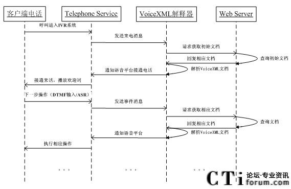 當VoiceXML解析器做完解析工作之后,遇到需要語音操作時,就得依靠調用Telephoney API來完成,同時Telephony Service需要向VoiceXML解析器去返回相應的語音操作結果事件。圖3.15描述了這一過程。