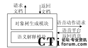 作為VoiceXML語言的解釋工具,文檔解析是VoiceXML解析器主要任務,也是執(zhí)行引擎的重要組成部分,文檔解析的內容決定了執(zhí)行平臺的下一步操作,也是整個系統(tǒng)運行的核心。因為VoiceXML文檔首先是一個XML文檔,所以主要包含對象樹生成模塊和語義解釋模塊兩個部分。其中對象樹生成模塊是對VoiceXML文檔進行XML方式的解析,解釋模塊使用FIA算法對生成的對象進行解析。圖3.13描述了VoiceXML解析器文檔解析的模型。