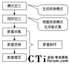 數(shù)據(jù)制作是報(bào)表生成過程的最后一個(gè)步驟,它在模式定義的基礎(chǔ)上,使用規(guī)則定義生成的映射規(guī)則集合將業(yè)務(wù)數(shù)據(jù)映射到報(bào)表中。根據(jù)數(shù)據(jù)規(guī)則的內(nèi)容,數(shù)據(jù)制作過程具體可以分為三個(gè)步驟,數(shù)據(jù)采集,數(shù)據(jù)變換,數(shù)據(jù)填寫。