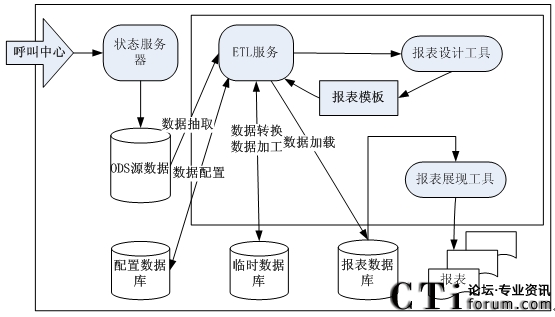 以上架構(gòu)圖中的呼叫中心是指呼叫中心系統(tǒng)的基礎(chǔ)話務(wù)功能部件,它是整個(gè)報(bào)表系統(tǒng)的基礎(chǔ),為其提供最初的數(shù)據(jù)來源,包括其基礎(chǔ)部件的通訊等。