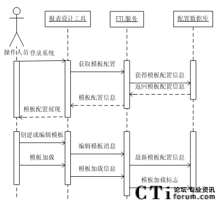基于以上軟件體系結(jié)構(gòu),在系統(tǒng)操作人員利用報(bào)表設(shè)計(jì)工具編輯模板時(shí),報(bào)表設(shè)計(jì)工具將模板修改信息發(fā)送給ETL服務(wù),ETL服務(wù)會(huì)將修改配置數(shù)據(jù)庫中的模板配置。
