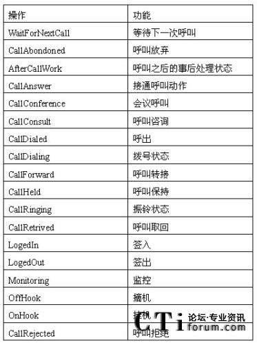 在呼叫中心服務(wù)器發(fā)送事件時,它都會對事件的對象指定的一個狀態(tài)。在任何時間,ODS源數(shù)據(jù)庫中,每個對象都被指定成一個唯一的狀態(tài)。這些狀態(tài)都來自話務(wù)對象的操作。