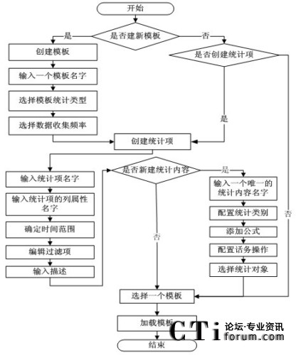 由模板結(jié)構(gòu)框架圖得知,模板包括模板名稱,數(shù)據(jù)統(tǒng)計對象,收集數(shù)據(jù)的頻率和多個基本統(tǒng)計項。其中,每個統(tǒng)計項對應(yīng)著統(tǒng)計對象(如:坐席,路由點等)的一條統(tǒng)計內(nèi)容信息(如:1小時內(nèi)的呼叫總量等)。然后由這些統(tǒng)計項和統(tǒng)計參數(shù)組合成模板,從而構(gòu)成對呼叫中心對象的統(tǒng)計信息。
