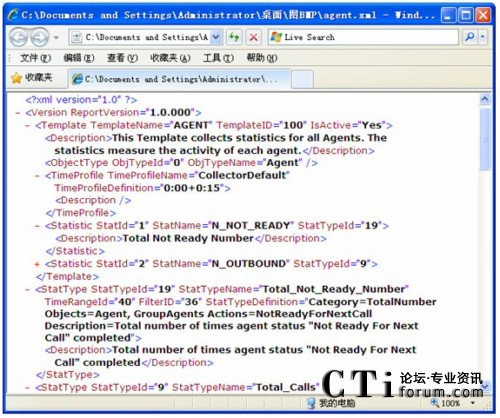 在模板導(dǎo)出的XML儲存圖中,ReportVersion屬性為報表系統(tǒng)的版本號。Template信息用來指定一個模板名字,給模板一個唯一的模板ID,再指定該模板是否激活,另外也為該模板添加了注釋。該例中是對所有坐席活動的數(shù)據(jù)進行統(tǒng)計。ObjectType為模板的統(tǒng)計類型,該模板中統(tǒng)計類型為坐席(Agent)。TimeProfile為設(shè)定收集的時間間隔,本例中為從每天的0點0分開始,每隔15分鐘收集一次。Statistic對應(yīng)了一個統(tǒng)計內(nèi)容配置,根據(jù)StatTypeID在下面將列出詳細(xì)內(nèi)容。本例中StatTypeID為19,下面的StatType中將會根據(jù)StatTypeID與之相對應(yīng),其中配置了Category,
