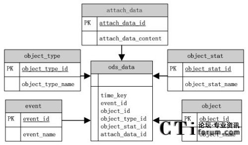 根據(jù)ODS源數(shù)據(jù)庫模型圖,ods_data表中存儲了事件發(fā)送的時間(time_key)、事件(event)、報表統(tǒng)計對象(object)、對象狀態(tài)(object_stat)、對象類型(object_type)以及一些隨路數(shù)據(jù)(attach_data)等信息。這些對象的詳細(xì)信息都是以各部分的ID來對內(nèi)容進行關(guān)聯(lián)。