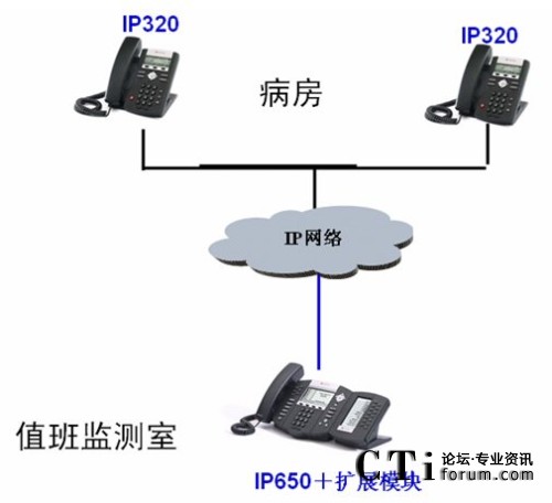 SoundPoint IP320。監(jiān)控室的值班醫(yī)生需要和患者溝通時,只需按IP650上病房相應(yīng)的快速撥號鍵,一鍵快速的呼叫病房的IP320。病房的患者也可以摘機或按免提鍵自動呼叫監(jiān)測室的IP650,和值班醫(yī)生進(jìn)行溝通。當(dāng)值班醫(yī)生和患者通話時,其它患者的電話呼叫監(jiān)測室,值班醫(yī)生可以看到是哪個病房呼叫的,可以馬上接聽,也可以結(jié)束當(dāng)前通話后根據(jù)通話記錄回呼患者進(jìn)行溝通。