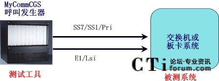 直接將MyCommCGS呼叫發(fā)生器與被測(cè)系統(tǒng)對(duì)接直連,連接電纜可以采用數(shù)字中繼或者模擬線(xiàn)路,信令支持中國(guó)7號(hào)、中國(guó)1號(hào)或者ISDN