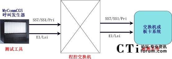 交換方案將MyCommCGS呼叫發(fā)生器和被測(cè)系統(tǒng)都通過(guò)同樣的電纜和信令方式連接到公網(wǎng)的程控交換機(jī)上,由呼叫發(fā)生器模擬公網(wǎng)用戶(hù)通過(guò)程控交換機(jī)向被測(cè)系統(tǒng)發(fā)起呼叫。