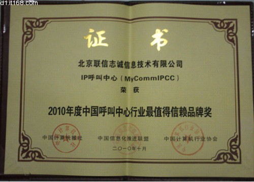 在本次評選中,北京聯信志誠信息技術有限公司(簡稱MyComm公司),其核心產品MyCommIPCC獨享 2010年度中國呼叫中心行業(yè)最值得信賴品牌獎。