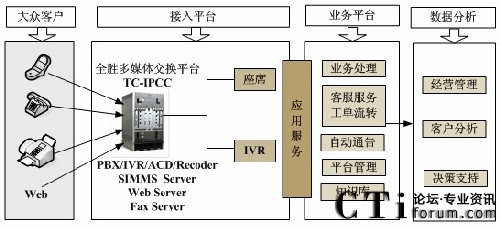 隨著呼叫中心技術(shù)的發(fā)展,傳統(tǒng)的語音通話已不能滿足日益增長的業(yè)務(wù)需求,TC-IPCC平臺(tái)整合了視頻Video、文本Text、電子郵件Email、短消息SMS、互聯(lián)網(wǎng)Web以及3G等多媒體通訊方式。高效、統(tǒng)一的把各種媒體渠道融合在一起,并極大地拓展了聯(lián)絡(luò)中心業(yè)務(wù)應(yīng)用的類型和范圍。