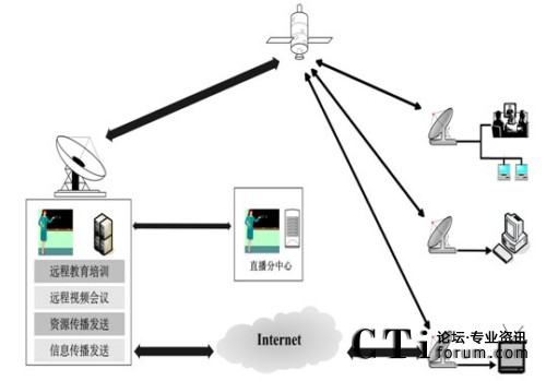 衛(wèi)星通信系統(tǒng)能實現(xiàn)組播、多點傳送和多媒體通信,支持多種媒體內(nèi)容的高速寬帶傳輸,時單向、雙向交互式的現(xiàn)代遠(yuǎn)程教育培訓(xùn),音視頻節(jié)目的實時播出和傳送,多媒體培訓(xùn)資源和數(shù)據(jù)的推送,音視頻、數(shù)據(jù)同步交互的遠(yuǎn)程視頻會議,信息資源的傳播和發(fā)送。