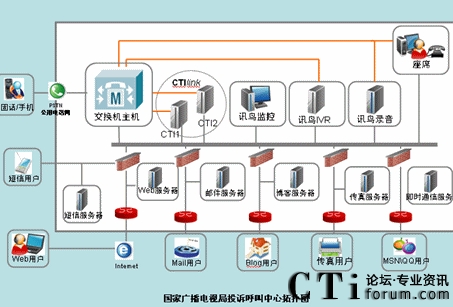 系統(tǒng)主要包含IVR服務(wù)器,CTI服務(wù)器,短信網(wǎng)關(guān),郵件服務(wù)器,傳真服務(wù)器,數(shù)據(jù)庫服務(wù)器,座席系統(tǒng)等。客戶撥打特服號碼接入廣電公司客服系統(tǒng),首先由IVR提供自動語音服務(wù)。CTI服務(wù)器負(fù)責(zé)所有的電話的路由、排隊、轉(zhuǎn)接和控制?蛻粼诮邮茏詣诱Z音服務(wù)時,如果需要人工幫助,可選擇轉(zhuǎn)入人工座席。由IVR系統(tǒng)向CTI發(fā)出轉(zhuǎn)接請求,完成轉(zhuǎn)接功能。