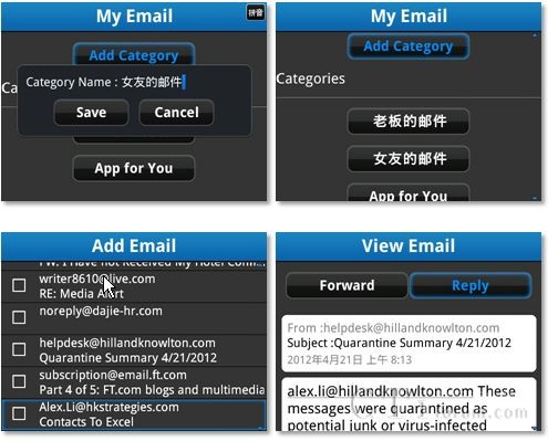 及時、安全的郵件收發(fā)是黑莓手機用戶鐘愛黑莓的重要原因之一。然而,當成千上百封郵件堆積在郵件系統(tǒng)內(nèi),疏于整理和歸類,以至于你無法找到或者挑選你想要的那封郵件中的信息時,你可能就沒那么Happy了吧?My Email應(yīng)用,可以稱之為你郵件系統(tǒng)的“管家婆”,安裝了它之后,你可以將所有郵件有條理的進行分類管理:公私分明、客戶分明、項目分明、老板同事分明,想瀏覽哪類郵件一目了然。此外,對于那些及其重要的郵件,“管家婆”還可以幫你儲存在SD卡上,即使原郵件已經(jīng)被刪除,儲存的郵件也可以被找回,如此一來,有限的手機存儲空間中就不必再存儲大量無關(guān)緊要的各種郵件,騰點空間給你心水的各種音樂圖片和視頻吧。