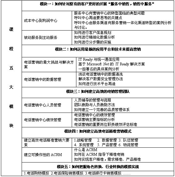 本課程以系統(tǒng)化的眼光,結(jié)合多個(gè)國際國內(nèi)領(lǐng)先企業(yè)的營銷與管理實(shí)踐案例,與您分享國內(nèi)領(lǐng)先的呼叫中心和電話營銷中心的戰(zhàn)略與運(yùn)營經(jīng)驗(yàn),對(duì)現(xiàn)有資源進(jìn)行合理評(píng)估,解決實(shí)際問題與困惑,突破面臨的瓶頸,整個(gè)課程具有高度的實(shí)戰(zhàn)性與可操作性。