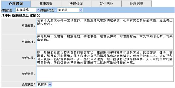 對于每次咨詢的受理以及答復(fù)記錄,是青少年咨詢平臺的重要組成部分。針對青少年的心理特點咨詢問題的類別,專門開發(fā)“12355”青少年服務(wù)臺業(yè)務(wù)受理系統(tǒng)。通過對來訪者的資料的登記,以及對咨詢服務(wù)的詳細(xì)記錄和電話錄音,今后可方便的查詢服務(wù)臺的的咨詢情況,并能有效的跟蹤處理,青少年遇到的心里、求學(xué)、婚姻和法律維權(quán)等方面的訴求。并能快速準(zhǔn)確的統(tǒng)計服務(wù)臺的各項服務(wù)的數(shù)據(jù)。