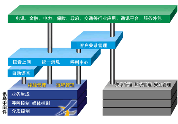而要支撐這些復(fù)雜的應(yīng)用,中間件應(yīng)該可以進(jìn)行接觸管理、流程管理。和目前已有的關(guān)系管理、知識管理、安全管理結(jié)合,可以全方位的支撐應(yīng)用系統(tǒng)。訊鳥中間件就是這樣的中間件,它是建立在分布式計(jì)算環(huán)境上,可以控制多種通訊設(shè)備,支撐生成多種業(yè)務(wù)應(yīng)用軟件的軟件。它可以支持語音網(wǎng)的交互,因特網(wǎng)的交互,支持呼叫和數(shù)據(jù)的同步傳輸。它支持工作流程的生成,而不用了解一個工作流程是如何在不同的設(shè)備上運(yùn)行。同時,它的業(yè)務(wù)描述語言是用中文和圖標(biāo)表達(dá),易于和業(yè)務(wù)接軌,方便系統(tǒng)集成商、最終客戶,給系統(tǒng)分析員提供優(yōu)秀的設(shè)計(jì)工具和運(yùn)行平臺,極大提高了工程的實(shí)施效率。