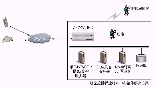 本方案采用AVAYA IP OFFICE系列交換機(jī),通過訊鳥中間件控制整個呼叫中心的電話呼入、呼出。它支持多種聯(lián)絡(luò)渠道,包括語音、交互式自動語音應(yīng)答(IVR)、傳真、電子郵件、web、短消息等,同時利用Myair航空管理系統(tǒng)來完成整個業(yè)務(wù)流程。