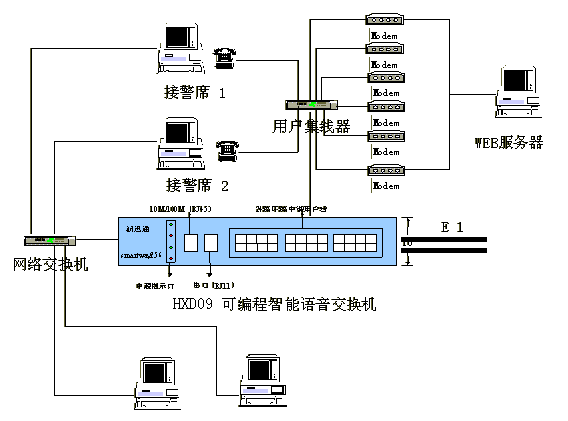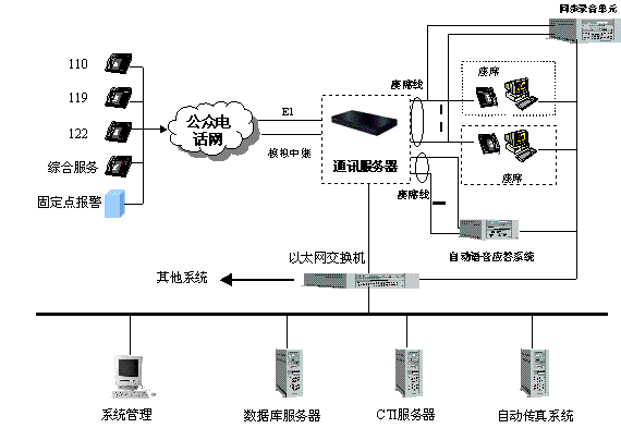 綜合接警平臺主要由hxd09可編程智能語音交換機和計算機網(wǎng)絡(luò)兩部分組成,交換機負責110、119、122報警電話的接入與分流及調(diào)度呼出等功能;計算機網(wǎng)絡(luò)則完成110、119、122報警信息的顯示、數(shù)據(jù)儲存、統(tǒng)計及信息查詢、發(fā)布功能。