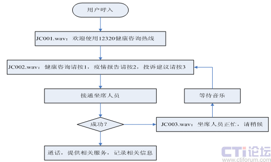 流程圖表示了正常工作期間的流程,實(shí)際技術(shù)流程會(huì)因?yàn)槭欠裨诠ぷ鲿r(shí)間、坐席人員是否繁忙等多種因素考慮,設(shè)置自動(dòng)語(yǔ)音內(nèi)容、語(yǔ)音留言等功能。