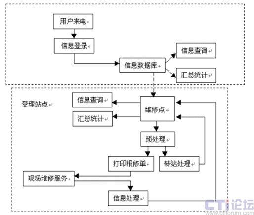 維修點對用戶的報修情況進行預處理之后,根據用戶所在的區(qū)域,分配至最近距離的維修站,將用戶與其報修信息即時轉移,這也就是圖中所顯示的"轉站處理"。之后,維修站將直接打印出報修單,加快服務實施的效率、減少人工出錯的比例,有專業(yè)人員及時上門服務檢修。