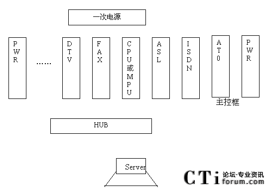 - CPU為256路主控板,對(duì)整個(gè)系統(tǒng)進(jìn)行主控,為整個(gè)系統(tǒng)提供時(shí)鐘入同步信號(hào)及交換網(wǎng),含一個(gè)10Base-T以太網(wǎng)口,通過(guò)HUB與Server進(jìn)行控制信息的交互