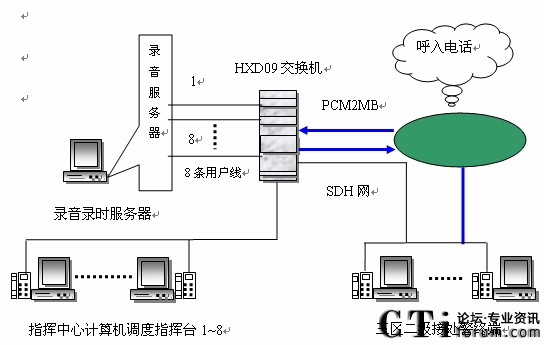 系統(tǒng)共包含4個(gè)E1,其中一個(gè)為公網(wǎng)呼入提供接口,另外三個(gè)可分別接入110、122(或120、119)。
