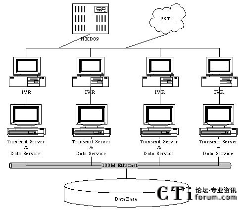 語音接入處理部分主要完成用戶的語音話路接入功能。其中:HXD09語音交換機可以支持七號信令和一號信令的數(shù)字E1線路的接入。HXD09的IVR完成自動業(yè)務(wù)受理功能,實現(xiàn)系統(tǒng)7*24小時不間斷服務(wù)。CTI完成對排隊機的監(jiān)視、控制任務(wù),并能夠?qū)崟r的提供每個語音通道的信息配合IVR完成自動繳費業(yè)務(wù)的實現(xiàn)。