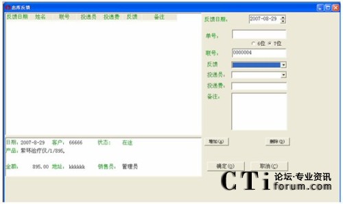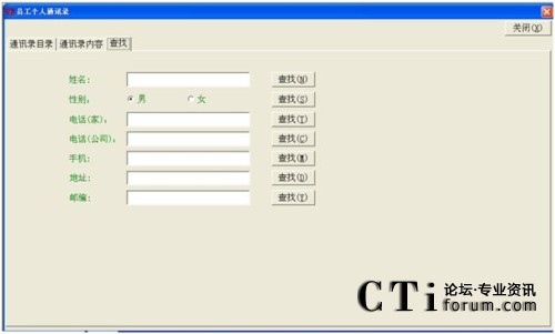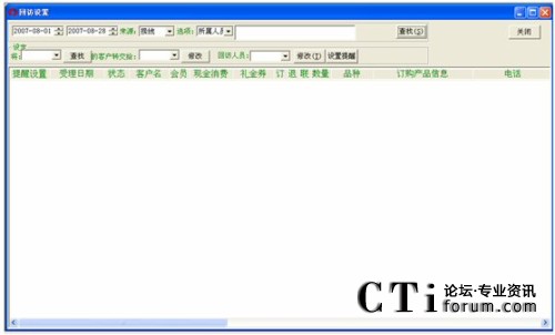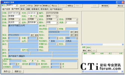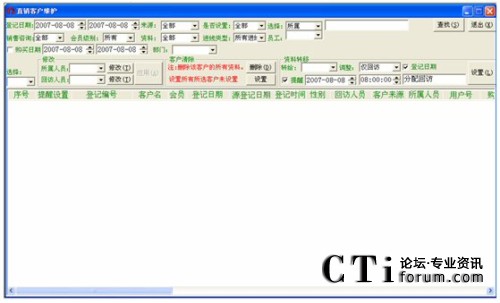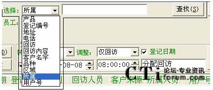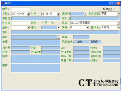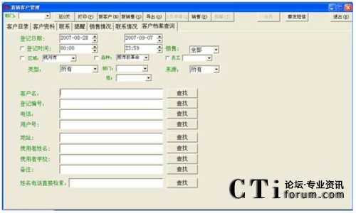 注:對于登記日期一直到客戶名這一段條件的查詢(即上圖中所有的那些查詢條件),都得點擊客戶名欄對應(yīng)的那個查找按鈕才能進行有效的查找,否則若點擊其它按鈕(姓名電話直接檢索對應(yīng)的查找除外),都會提示“請輸入****”這種錯誤信息。而點擊最后一個查找,也是無效的,會轉(zhuǎn)到客戶管理中空白信息欄(即什么也查不到)。